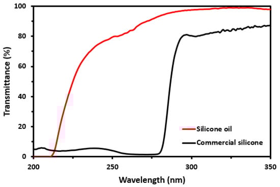 The silicone oil we used in this study was dimethylpolysiloxane, with the part number KF-96-50CS (Shin-Etsu Chemical Co., Ltd, Tokyo, Japan). Its refractive index was 1.487 [16] in the UVC range and its transmission spectrum, shown in Figure 2, was measured by spectrophotometer (model name: U2900, Hitachi, Tokyo, Japan). The result shows that the transmittance of the silicone oil was over 82% from 260 nm to 350 nm. The structure of silicone oil is very simple, it is composed of Si-O and Si-CH3 functional groups. The main chain of silicone oil is bonded by Si-O, which has a high bonding energy of 108 Kcal/mol. It is not easily broken by UVC and ultraviolet B (UVB) (290–320 nm), since UVC and UVB energy is 102 Kcal/mol and 91 Kcal/mol, respectively. This characteristic makes silicone oil transparent from 260 to 350 nm. In commercial silicone, due to its solid property, some CH2 functional groups will be added to the main structure to make the main chains longer and the molecular weight higher. When CH2 functional groups are in the main chain, C-C bonds occur, which have a low bonding energy of 85 Kcal/mol. In addition, some additivities like the phenyl group, UV absorber and hardener are added to the commercial silicone. These additivities will reduce the transmittance in the deep-UV range. In Figure 2, we also added the transmission spectrum of the commercial silicone Dow corning, OE66 series, for comparison in the deep UV region. The high transmittance of this wavelength range (260 nm to 350 nm) of silicone oil is very useful for deep-UV LED packages, since most recent investigations and applications of deep-UV LED are in this wavelength range [1,2,17,18]. For 281 nm, the transmittance of silicone oil is about 94%.