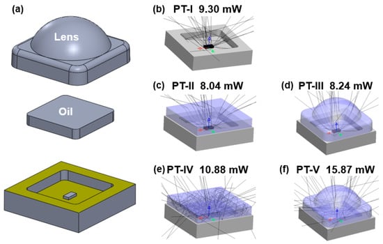 (a) 3D model for the simulation, and the simulation results for the output power for (b) PT-I, (c) PT-II, (d) PT-III, (e) PT-IV, and (f) PT-V DUV-LEDs.