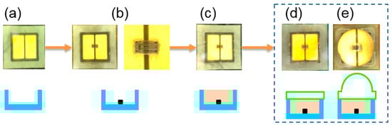 The packaging process of the proposed DUV-LED is illustrated in Figure 4. First, we prepared a ceramic substrate whose electrode and reflectance material are gold, see Figure 4a. Second, we bonded the peak wavelength 281 nm DUV-LED chip to the ceramic substrate using a soldering bonding process, as shown in Figure 4b. Additionally, the bonding picture of the 281 nm, 250 × 500 μm DUV-LED chips is also illustrated in Figure 4b. Then, we filled the silicone oil (part number: KF-96-50CS, Shin-Etsu Chemical Co., Ltd., Japan) into the cavity, see Figure 4c. After that, in Figure 4d we placed and sealed the flat type quartz plate onto the substrate with the sealing condition at 80 °C for 30 minutes. The lens type of the DUV-LEDs in Figure 4e was prepared the same way.