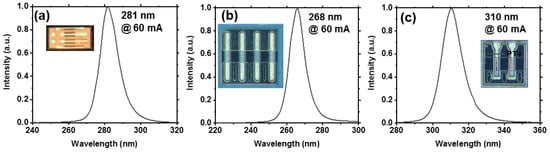 In this part, we tested the optical performance of three different wavelength chips (281 nm, 268 nm, and 310 nm) in five different package structures, described in Figure 1. The chip layout and spectrum at 60mA for three different wavelength chips are shown in Figure 5. These chips were all flip chip type and their sizes were 250 × 500 μm, 760 × 760 μm, and 500 × 500 μm for 281 nm, 268 nm, and 310 nm.