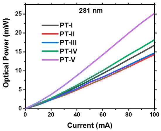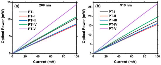 Optical power of the five PTs for (a) 268 nm and (b) 310 nm DUV-LEDs.