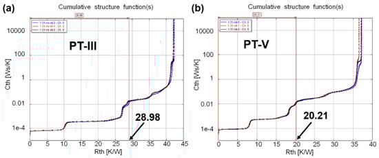 Some papers have shown that there is great potential for the use of silicone oil as a heat transfer material [20,21,22]. Some studies have shown that the reduction of thermal resistance could be up to 30% [22] using a liquid type structure for UVA LED. Since the EQE of DUV-LEDs is still low, the thermal management of DUV-LEDs is very important. The thermal resistance of liquid packaging DUV-LEDs was also measured using a T3Ster system (Mentor, USA), and the results are shown in Figure 8. The thermal resistance of the conventional structure of the 281 nm DUV-LED package was 28.98 K/W, as shown in Figure 8a. The thermal resistance of the liquid packaging structure of the 281 nm DUV-LED package was 20.21 K/W, as shown in Figure 8b. The reduction of the thermal resistance using the liquid packaging structure was 30.3%, which is very similar to previous work [22]. Thermal resistance reduction due to silicone oil was also observed for the DUV-LED package in this study. Referring to the heat dissipation mechanism of the liquid packaging from the previous study [23], the major route of the heat generated from the chip was not through the top of the LED package, thus a comparison of the thermal resistance for the flat type and lens type was not carried out here, and only the DUV-LED package with or without silicone oil was discussed.