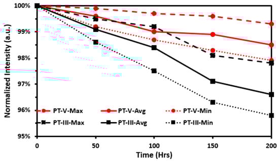 The light maintenance of the 281 nm liquid packaging DUV-LEDs for 200 hours was tested, and the results are shown in Figure 9. PT-V-Max, PT-V-Avg, and PT-V-Min represent the maximum, average, and minimum value of the light maintenance of the liquid packaging PT-V DUV-LED, respectively. PT-III-Max, PT-III-Avg, and PT-III-Min represent the maximum, average, and minimum value of the light maintenance of the conventional PT-III DUV-LED, respectively. We tested five samples for each PT-III and PT-V DUV-LED to compare the reliability results with and without the liquid packaging design. The test environment was at room temperature of 25 °C and the driving current was 60 mA. The result shows that the average light maintenance of the liquid packaging DUV-LED and conventional DUV-LED was 98.5% and 96.6%, respectively. The light maintenance of both structures was at the same level, and the liquid packaging PT-V DUV-LED performed better than conventional one. This implies mass production possibilities for this liquid packaging PT-V DUV-LED.