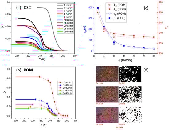 The growth of the crystal Cr from SmBcr upon cooling was also monitored by polarized microscopy (POM) observations of the texture evolution as described in the experimental section. It is evident in Figure 2b,d that the crystalline centers grow equally in all directions and their number increases with decreasing temperature. The crystallization temperature Tc and crystallization characteristic time τcr determined using POM are in good agreement with the values obtained by DSC (Figure 2c).