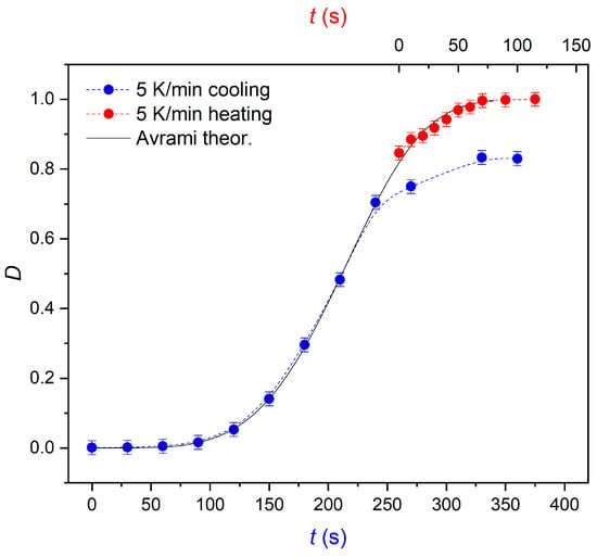 Time evolution of the crystallinity degree D(t) observed by POM on cooling (partial crystallization) and heating at the rate of 5 K/min. The black line denotes the theoretically-predicted Avrami curve.
