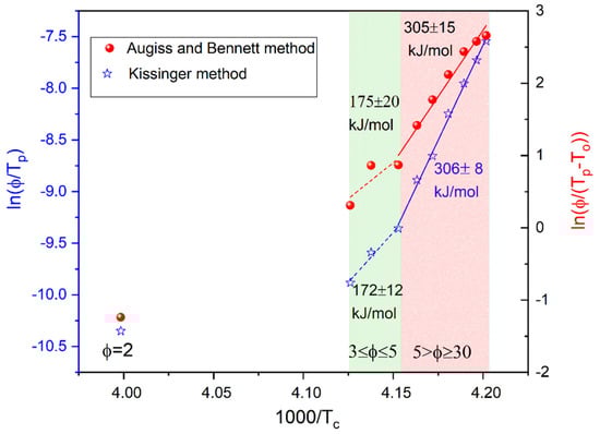 where C and CAB are fitting parameters, ϕ means a cooling/heating rate, Tp indicates the maximum crystallization peak and T0 is the onset temperature of crystallization. Two different linear dependences were found for K/min and , indicating two different mechanisms of crystallization for slow and fast cooling (see Figure 4). The values of Ec estimated using both methods coincide and are approximately equal to 175 kJ/mol and 305 kJ/mol for the slow and fast cooling, respectively.