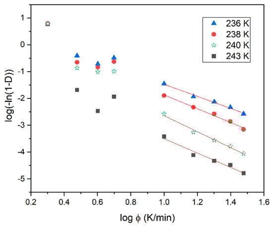 where D is the relative degree of non-isothermal crystallization, nO is the Ozawa exponent depending on the dimensionality of the crystal and Z(T) is the Ozawa crystallization rate. It is evident in Figure 5 that the Ozawa analysis provides a good description of the non-isothermal crystallization of the BBOA SmBcr phase only during cooling, with ϕ ≥ 10 K/min. For fast cooling the plots of log(−ln(1−D)) versus log(ϕ) yield a straight line with nO being the slope and log(Z(T)) the intercept with the y-axis. The value of log(Z(T)) decreases with increasing temperature (Table 1), indicating that non-isothermal crystallization for fast cooling occurs in the diffusion-controlled region.