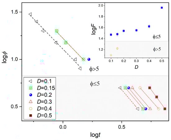 Plots of logϕ versus logt for a selected degree of crystallinity D during non-isothermal crystallization in the SmB phase of BBOA. The inset shows the dependence of logF on the crystallinity D.