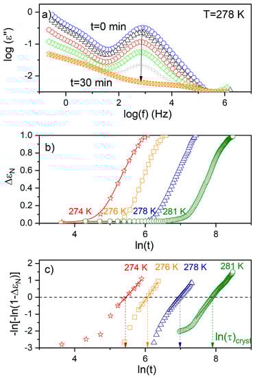 BDS is primarily intended to probe the response of polar substances to an external variable electric field. During the crystallization process, the number of fluctuating dipoles in a substance is gradually reduced, which is reflected as a decrease of the amplitude of the dielectric loss spectra ε’’(f) (see Figure 7a) and the dielectric strength (, where and are values of the real part ε’ in the limit of low and high frequency, respectively). The evolution of the degree of crystallinity with time can be related to the change in normalized dielectric strength ΔεN as follows: