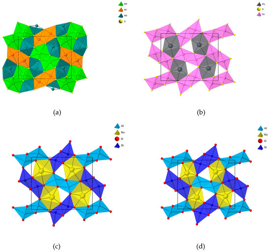 Crystal structures of: (a) galenobismutite, projected along [001] with x axis on the vertical and y axis on the horizontal line; (b) PbSc2S4 [19]; (c) NaAlSiO4 at room pressure [16]; (d) NaAlSiO4 at 35 GPa [20].