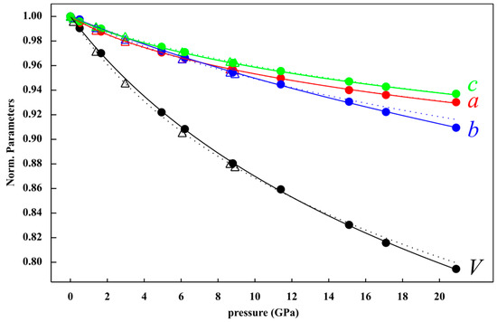 Evolution of the unit cell volume and a, b, c lattice parameters normalized to the values at room conditions as a function of pressure (GPa), fitted by a third-order Birch-Murnaghan EoS. Olsen et al. [21] data are shown by stippled lines and triangles for comparison.