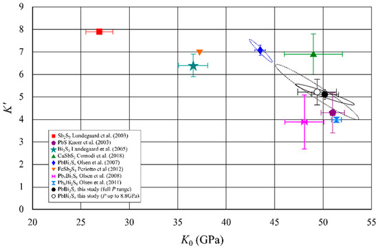 To compare the present data with those of other sulfides of metalloids from literature (galena [31], bismuthinite [32], stibnite [33], chalcostibite [34], lillianite [35], heyrovskyite [36], berthierite [37]) a K’ vs K0 plot was elaborated (Figure 4). In the plot, the confidence ellipses at 90 and 68 % of confidence level for the present data and those reported by Olsen et al. [21] are shown. In order to allow a more direct comparison of K0 and K’ calculated with the two data sets and to evaluate if the observed differences were due to the different pressure range, we also calculated K0 and K’ restricting our data to the same pressure range investigated by Olsen et al [21]. We observed a strong negative correlation between K’ and K0 in agreement with the data presented by Olsen et al. [21]. However, the ellipsoides for the two data sets did not overlap, even if they are quite close. The reason might be that the results of Olsen et al. [21] were biased by an unequal distribution of pressures at which the data were measured.
