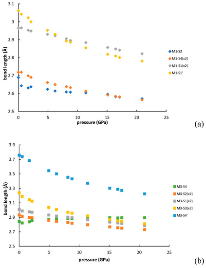 Taking into account the changes in bond distances and distortion parameters plus the global aspects of the crystal structure, the changes that occur in galenobismutite under increasing pressure can be summarized as follows: The main change is that both M2 and M3 atoms move towards the centers of the bodies of respective trigonal prisms. It can be visually verified by comparing the crystal structures at 1 bar and 20.9 GPa, as represented in Figure 8, and by checking the development of the bond lengths, as in Figure 5. Here, the atoms making the body of the trigonal prism were two S3 atoms, two S2 atoms plus S3 and S1 for M2. Note that bond distances to these six S atoms showed a merging tendency with increasing pressure. The distance to the capping S4 atom decreased with a much lower gradient than the ones to two S2 plus S1 atom (that are longer at 1 bar) and actually became the longest one from 12 GPa on. In the case of M3, two S2, two S1 and two S3 atoms formed the prism body and one can observe the same tendency of merging the bond distances up to approximately 10 GPa; above this pressure they became the shortest bond distances in the coordination polyhedron. It is true that the longest distance to one of the capping S4 atoms had a significant decrease during the whole measurement range, but with a gradient that was similar to the one of the two S3 atoms belonging to prism body. On the contrary, the distance to the other S4 capping atom actually slightly increased under compression. This all testifies also in this case that M3 moves inside the body of the trigonal prism with a consequence that it also moves away from the closest capping S4 atom. As the distance to the other one largely decreases due to its approach to the prism body, the two distances to the capping S atoms show a merging tendency and we can assume that the coordination’s character changes from the 7+1 type towards the real CN8, becoming a more regular bicapped trigonal prism (also confirmed by the values of the shape distortion in Figure 7c).
