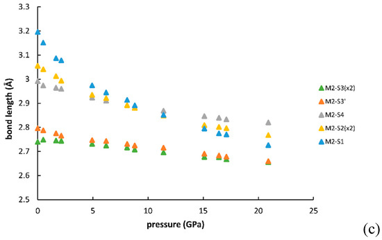 The changes in the M1 coordination were very small compared to M2 and M3. The eccentricity of this site changed very little (Figure 7a) as the difference between the three shortest and three longest bonds remained almost the same (Figure 5a). There was actually a slight but constant increase in the distortion of the octahedral shape (Figure 7c). The main change in this coordination is due to the polyhedral accommodation to the contraction of the b axis that had the largest compressibility (Figure 2 and Figure 8a). The expression of the LEP of M1 slightly changed, but its orientation, seen from the atomic nucleus, changed more significantly from the diagonal one, oriented towards the space between the two neighboring M1 coordinations, to a direction along the b axis (Figure 8b). The changes in the expression of LEPs of M2 and M3 were more significant and their orientations changed to directions closer to the M2-capping S and M3-most distant capping S, in accordance to the movement of M2 and M3 towards the centers of their respective trigonal prisms.