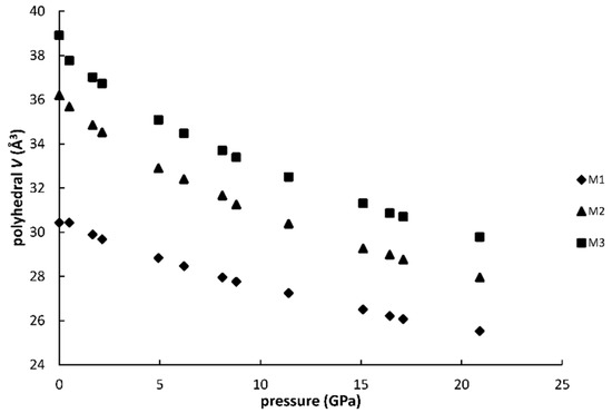 The M1, M2 and M3 polyhedral evolution with pressure was analyzed through changes in bond lengths and polyhedral volumes reported in Table 3.
