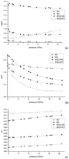 Variation of polyhedral volume for M1 (a), M2 (b), M3 (c) polyhedra with pressure.