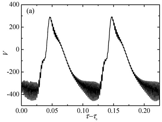 The time dependencies of azimuthal velocity V at the monitoring point P (R = 0.75, Z = 0.5, θ = 0) when Rec = 0 and ReT = 104. (a) Res = −1.8 × 103; (b) Res = −2.3 × 103.