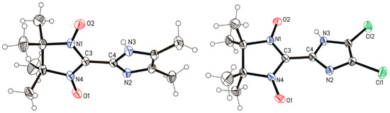 N,N′-(2,3-dimethylbutane-2,3-diyl)bis(hydroxylamine) (1480 mg, 10 mmol) was added at room temperature to a stirred solution of 4,5-dichloro-1H-imidazole-2-carbaldehyde (1650 mg, 10 mmol) in dimethylformamide (DMF, 20 mL). The reaction mixture was stirred for 48 h at 30 °C under Ar, and then DMF was removed under a stream of air. The resulting pale white powder was dissolved in ethanol (50 mL), and MnO2 (4.5 g, 50 mmol) was added. The reaction mixture was stirred for 3 h at room temperature and filtered. The mother solution was concentrated to a volume of ca. 10 mL and placed onto an Al2O3 column. The latter was subjected to elution with ethanol, and a bluish violet fraction was collected; the fraction was evaporated. The solvent was distilled off, the residue was ground up with hexane, and the solvent decanted. Yield: 760 mg (26%); blue crystals; m.p. 86–88 °C; IR (KBr): ῦ = 455 w, 507 vw, 543 m, 576 w, 611 w, 649 w, 705 w, 719 vw, 738 w, 761 w, 831 vw, 870 m, 962 vw, 972 vw, 1026 m, 1138 m, 1175 m, 1217 m, 1240 w, 1296 w, 1332 s, 1353 s, 1373 s, 1403 vs, 1427 vs, 1450 s, 1510 m, 1548 m, 1579 w, 1621 w, 1629 w, 1677 w, 1768 w, 2618 w, 2794 m, 2989 m, 3425 m·cm−1; UV/Vis (EtOH): λmax (ϵ) = 323 vs (16800), 370 w (2980), 628 vw nm (580 mol−1·dm3·cm−1) (Figures S6 and S7); elemental analysis calcd (%) for C10H13N4O2 (291.04): C 41.11, H 4.49, N 24.27; found C 41.03, H 4.45, N 24.28.