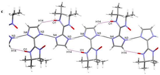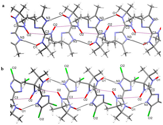 In solid 1a and 1b, NH groups of the imidazole ring participate in the formation of intramolecular and intermolecular hydrogen bonds of the NH…O type. The latter causes formation of one-dimensional (1D) infinite chains of molecules along axis a with distances N…O 2.874(2) for 1a and 2.811(3) Å for 1b (Figure 2). Inside the chains, there are short intermolecular contacts between O atoms of one molecule and C3 atoms of an adjacent molecule, 3.145(2) and 3.050(3) Å, respectively, in 1a and 1b (note that a normal O...C contact is 3.35 Å [31]). The aforementioned contacts NH…O are slightly shorter than those between O atoms [3.291(2) Å in 1a, and 3.125(3) Å in 1b].