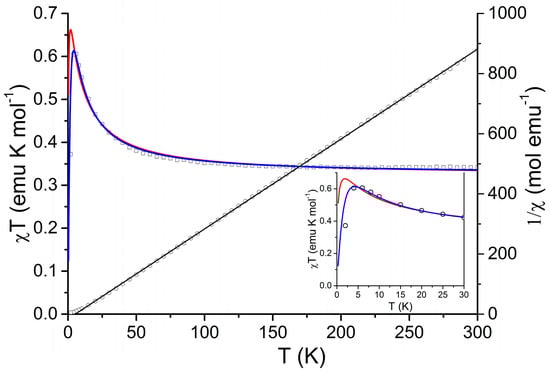 The 1/χ temperature dependence above 20 K is fitted well by the Curie–Weiss law () with Curie constant C = 0.334 ± 0.001 emu⋅K⋅mol−1 and Weiss temperature θ = 5.4 ± 0.3 K (Figure 3, black line). The temperature dependence of χT was fitted to the 1D-Heisenberg ferromagnetic model [32,33] taking into account the weak antiferromagnetic interaction between radicals of neighboring chains in the mean field approximation (1)