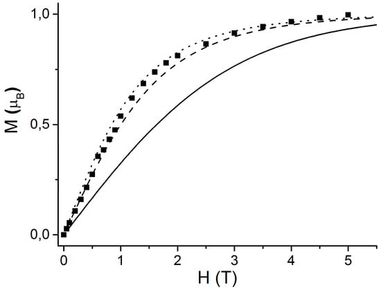 Magnetic susceptibility data (at 2–300 K) on polycrystalline samples were determined using an MPMS-XL SQUID magnetometer of Quantum Design (San Diego, CA, USA) in a 0.1 T applied magnetic field. The magnetization isotherm was recorded between 0 and 5 T. All data were corrected for a contribution of the sample holder and diamagnetism of the samples estimated via Pascal’s constants [23].