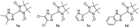 Long-range ferromagnetic ordering has been and is the main target of many scientists looking for organic magnets [1]. The key point in the design of pure organic magnetic materials is the assembly of the building blocks (spin-carriers) so that they interact ferromagnetically. This is a fundamental problem because the relationship between the relative orientation of the radicals in a crystal and the magnetic properties of the paramagnetic crystals is complicated. The reason is that the magnetic behavior of monoradicals results from a combination of the magnetic intermolecular interactions generated by the individual contacts, which depends on all the functional groups present in the paramagnetic molecule [2]. This fact makes it impossible to perform magneto–structural analysis of all available data on purely organic paramagnets. It is more fruitful, we believe, to concentrate on a series of compounds having closely related structures tending to form similar first crystalline motifs. These motifs are formed due to the strongest intermolecular contacts among which hydrogen bonds are the most predictable, and simultaneously they have an important role in the propagation of ferromagnetic interactions in organic molecular solids [3,4,5,6,7,8,9,10,11,12]. Keeping all this in mind, we performed the synthesis and characterization of new nitroxide radicals 1a,b carrying an imidazole ring substituted at positions 4 and 5 with methyl groups or chloro-atoms (Scheme 1). It was found that the introduction of substituents into the imidazole ring leads to a change in the first crystalline motif or primary structure of 1a,b as compared to 1c. As a result, the dominating strong antiferromagnetic exchange interactions inherent in 1c changed to the ferromagnetic ones observed in 1a,b. Of note, benzo-annelation of the imidazole ring in 1d has the same effect, thus, ensuring similarities of magnetic properties between 1a,b and 1d.