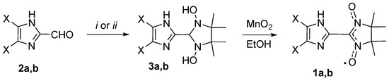 Synthesis of nitronyl nitroxides 1a and 1b (X = Me, i: N,N′-(2,3-dimethylbutane-2,3-diyl)- bis(hydroxyl-amine) (BHA)∙H2SO4, water; X = Cl, ii: BHA, dimethylformamide (DMF)).