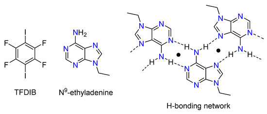 In this work, we selected N9-ethyladenine since we were interested in investigating its halogen bonding capability and the competition with hydrogen bonding. In a biochemistry sense, adenine derivatives are valuable compounds. In addition, from a crystal engineering standpoint, they are interesting due to the presence of various potential donor and acceptor sites. In spite of this potential interest, a search in the Cambridge Structural Database (CSD) [20] version 5.39 (last updated August 2018) revealed that there is not any X-ray structure comprising N9-substituted adenine as a halogen bond acceptor in the database. In this manuscript, we report the cocrystallization of N9-ethyladenine with 1,2,4,5-tetrafluoro-3,6-diiodobenzene (TFDIB). The solid-state structure of this cocrystal shows that adenine has a strong ability to form self-assembled and centrosymmetric H-bonded dimers where only N3 atoms (see Figure 1) remain available to establish X-bonding interactions. The ditopic TFDIB (Figure 1) is then able to connect the infinite 1D assemblies generated by the H-bonding network. We have used DFT calculations to analyze and compare the competitive H-bonding and X-bonding interactions, and also the influence of the H bonds on the X bond acceptor ability of N3.