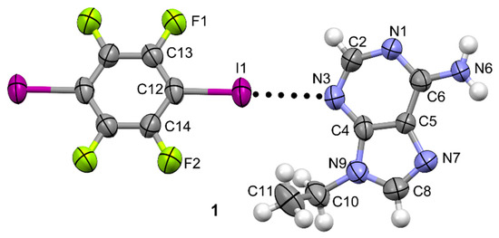 Comparison of the experimental pattern for the solid obtained after grinding and the simulated pattern from the single crystal structure resulted in good agreement, confirming that cocrystal 1 could be obtained by both methods, grinding and evaporative crystallization (see Figure S1 in Supplementary Materials). It was further analyzed by ATR-FT-IR (Figure S2). It was expected that hydrogen and halogen bond formation would induce small changes in the associated bands of the participating molecules. For N9-ethyladenine, an upshift in the corresponding bands for N-H and C=N from 1669, 1595, and 1571 cm−1 (free) to 1673, 1604, and 1572 cm−1 in cocrystal is observed. In the case of the TFDIB, the IR active νC-C and νC-F stretch modes are slightly upshifted from 1456 and 937 cm−1 (free) to 1459 and 939 cm−1 in the cocrystal. These small changes might be assigned to the intermolecular interactions between molecules.