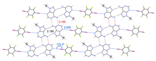 In this structure, N9-ethyladenine molecules aggregate creating infinite 1D zig-zag tapes as a consequence of the formation of self-complementary H-bonding interactions (see Figure 3), both through the Watson–Crick edge (N6···N(1) distance: 2.166 Å; angle 167.54°; red dotted lines) and the Hoogsteen edge (N6···N(7) distance: 2.196 Å; angle 159.68°; black dotted lines). Interestingly, TFDIB links N9-ethyladenine zig-zag tapes by establishing two symmetrically equivalent halogen-bonding interactions (N(3)···I(1) distance: 2.939 Å; angle 175.28°; blue dotted lines).