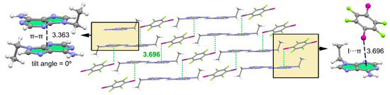 As shown in Figure 4, the final 3D architecture of this compound is generated by the stacking of the 2D supramolecular planes described above (see Figure 3). It is worth mentioning that in addition to the π–π stacking interactions involving the adenine moieties (see Figure 4, left), lp–π interactions are also established between the negative belt of the iodine atom and the π-system of N9-ethyladenine (see Figure 4, right). This type of X···π interaction where the negative belt of the halogen interacts with an acidic π-system has been previously described and discussed in the literature [34,35]. The I···π interaction is represented in Figure 4 as green dotted lines. The distance between the centroid (Cg) of the six-membered ring and iodine is 3.696 Å and the C–I···Cg angle is 100.38°.