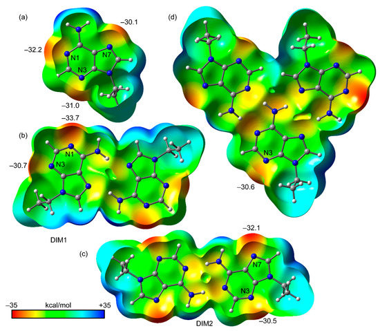 Open molecular electrostatic potential (MEP) surfaces (0.001 a.u. isosurface) of N9-ethyladenine (a), DIM1 (b), DIM2 (c), and the trimer (d). The MEP values at selected points of the surface are indicated in kcal/mol.