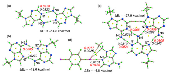 We have optimized the dimers and trimer shown in Figure 6 and computed their interaction energies. Moreover, we have also obtained the Atoms in Molecules (AIM) distribution of bond critical points and bond paths to further analyze the cooperativity features commented on above. A bond path in combination with a bond critical point connecting two atoms is a clear indication of interaction [42]. It can be observed that the Watson–Crick dimer is 2.2 kcal/mol more stable than the Hoogsteen dimer. This agrees well with the values of ρ(r) and ∇2ρ(r) at the bond critical point (CP) that characterize the H-bonding interaction (small green spheres in Figure 6) and that are higher in the former (values in italics). It is well known that the values of ρ(r) and ∇2ρ(r) at the bond CP can be conveniently used as a measure of the strength of the interaction [43]. Quite remarkably, the interaction energy of the trimer (ΔE3 = −27.9 kcal/mol) is 0.5 kcal/mol more favorable than the sum of the two dimers (ΔE1 + ΔE2), thus suggesting a favorable cooperativity and agrees well with the formation of the infinite 1D tape in the solid state of the cocrystal. The distribution of bond CPs and bond paths in the trimer reveals an H···H interaction in the trimer that is established between C–H groups from the six- and five-membered rings of two adenine moieties. The interaction energy of the halogen bonded complex (Figure 6d) is moderately strong (ΔE4 = −4.8 kcal/mol), thus revealing that the H bonds are stronger than the X bonds in this particular system. The distribution of bond CPs and bond paths in this dimer suggests the existence of some ancillary C–H···I interactions involving the H atoms of the ethyl groups, which are expected to be very weak. Previous studies have reported the relevance of C–H···I interactions in the structure and properties of triiodobenzenes [44] and 1-methylpyridinium iodide derivatives [45]. The values of ρ(r) and ∇2ρ(r) at the bond CP that characterize the X-bonding interaction are smaller than those at the bond CPs of the H bonds in the dimers (Figure 6a,b), in line with the energetic results.
