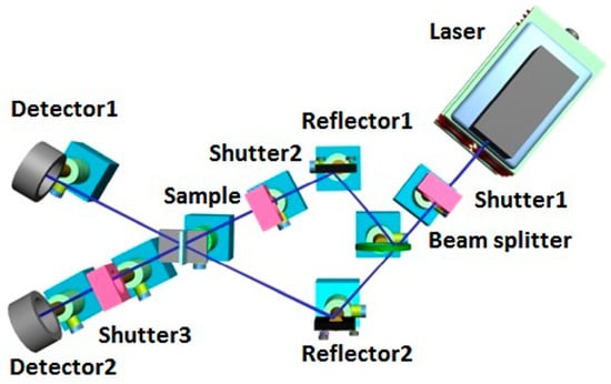 We measured the diffraction efficiency and response time of the crystals by the two wave coupling holographic experiment as shown in Figure 1. Two writing beams of extraordinary light with equal light intensity were employed to write the holograms, and their crossing angle was designed to be 30° in air. The instruments used in the experiments were helium cadmium laser (442 nm), argon ion laser (488 nm), and semiconductor solid state laser (532 nm and 671 nm). The total light intensities used here were 250 mW/cm2 for 442 nm, 400 mW/cm2 for 488 nm and 532 nm, and 1200 mW/cm2 for 671 nm. The measured diffraction efficiency was defined as , where Id and It is the diffracted and transmitted light intensities of the readout beam, respectively. The response time constant τr and the saturation diffraction efficiency ηs were deduced by fitting the function to the data. The photorefractive sensitivity [] was defined as , where I is the recording intensity and L is the grating thickness. The UV-visible transmission spectrum of the crystals was measured using a UV-4100 spectrophotometer (Hitachi Science and Technology, Tokyo, Japan) with a range of 300–800 nm and a resolution of 1 nm/step. The measurement of the infrared spectrum was carried out by A MAGNA-560 FT-IR spectrometer (Thermo Nicolet Corporation, Madison, America) with a range of 400–4000 cm−1 and a resolution of 2 cm−1/step.