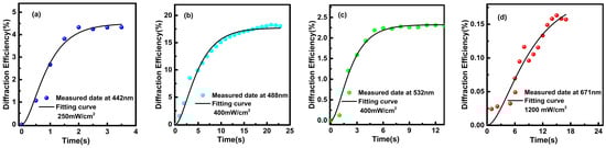 The diffraction efficiency of the 7.2 mol% Zn and 0.5 mol% Mo codoped with LiNbO3 (LN:Mo,Zn7.2) crystal versus time at (a) 442 nm, (b) 488 nm, (c) 532 nm, and (d) 671 nm laser, respectively.
