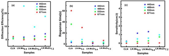 (a) The diffraction efficiency, (b) response time, and (c) photorefractive sensitivity of CLN, LN:Mo0.5, LN:Mo,Zn5.4, and LN:Mo,Zn7.2 crystals at 442 nm, 488 nm, 532 nm, and 671 nm lasers, respectively.
