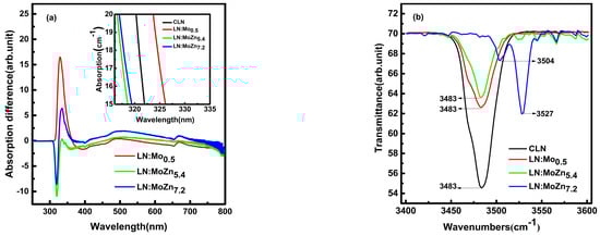 From the FT-IR transmission spectrum which is shown in Figure 4b, we can observe that in the LN:Mo,Zn crystals, the main absorption peak of LN:Mo,Zn7.2 crystal appeared at 3527 cm−1, the minor peak appeared at 3504 cm−1, and the peak appeared at 3483 cm−1 in CLN, LN:Mo0.5 and LN:Mo,Zn5.4. The absorption peak transferred from 3483 cm−1 to 3527 cm−1, which implies that the Zn2+ concentration in LN:Mo,Zn7.2 crystal exceeded the threshold, the (NbLi)4+ defects disappeared, and the (ZnNb)3− appeared in the crystal.