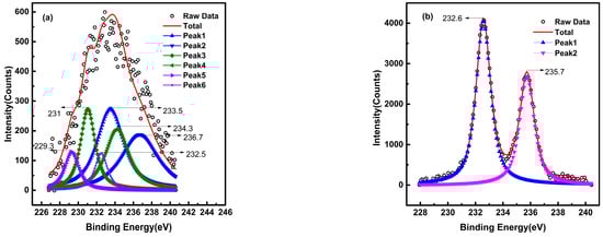 To detect the defect structures inside the crystal, we analyzed the valence of Mo ions of LN:Mo,Zn7.2 crystal by the X-ray photoelectron spectroscopy (XPS) []. As shown in Figure 5a, molybdenum ions exhibited three valence states in the LN:Mo,Zn7.2 crystal, in which the combined peaks of 233.5 eV and 236.7 eV represent +6 valence, the peaks of 231 eV and 234.5 eV represent +5 valence, and the peaks of 229.3 eV and 232.5 eV represent +4 valence. As a comparison, the molybdenum element in the residue of the crucible only showed a +6 valence state formed by two combined peaks of 232.6 eV and 235.7 eV shown in Figure 5b. These results show that the valence states of Mo ions changed when they enter the crystals, which lead to the generation of new defects.