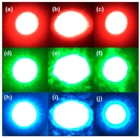 The incident spots of (a) 671nm, (d) 532nm, and (h) 488nm lasers; (b,e,i) transmitted spots of LN:Mo,Zn5.4 crystals under the action of different color lasers; (c,f,j) transmitted spots of LN:Mo,Zn7.2 crystal under the action of different color lasers.