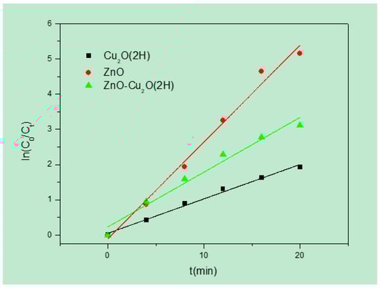 Pseudo-first-order kinetics reaction was applied to simulate the experimental data with the Langmuir–Hinshelwood model ln(C0/C) = αt, where α is the pseudo-first-order rate constant, and was determined from a linear fit to the experimental data [,]. Figure 5 shows that experimental data can be fitted well using the pseudo-first-order kinetics. The rate constant α is determined to be about 0.02, 0.129, and 0.275 min−1 for Cu2O, ZnO-Cu2O, and ZnO, respectively. The higher α of ZnO indicates that ZnO has the greater adsorption ability towards MO. The weaker adsorption ability of ZnO-Cu2O may be related to the reduction in specific surface area and positive charges on surface []. ZnO and Cu2O are n-type and p-type semiconductors, respectively. The depletion region at the interface of the p-n junction [] may reduce the positive charges on the surface. The adsorption of MB for Cu2O, ZnO-Cu2O, and ZnO is too small to be detected. The weak adsorption of MB should be due to the positively charged surface of adsorbents [,].