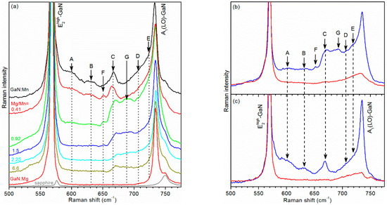 The Raman spectra from the studied GaN:Mn, GaN:Mg, and GaN:(Mn,Mg) samples at a sub-band excitation of 2.54 eV are shown in Figure 2a and are characteristic for GaN doped with Mn and/or Mg [8], where impurity-induced Raman features are detected in the region between the and the A1(LO) modes of GaN at 569 cm−1 and 735 cm−1, respectively. Using an approach similar to the one employed in [8,9], the impurity-induced features found in GaN:Mn are denoted as (A,B,C,D,E). Band C is the most prominent feature related to Mn and scales with the Mn concentration, while bands (A,B,D,E) originate from disorder-induced scattering due to the activation of phonon DOS [9].