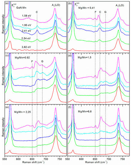 The Raman analysis is performed at various excitation energies to gain a deeper insight into the nature of the impurity-induced Raman features in GaN:(Mn,Mg). The Mn-induced features of GaN:Mn show a resonant behavior as a function of the excitation energy with a maximum enhancement at 2.41 eV (Figure 3a). The effect is most prominent for band C at 670 cm−1. The observed behavior was explained through a resonance process involving electron transitions from the localized level of Mn2+ to the conduction band and its subsequent recombination with Mn3+ with the emission of LO phonons [9,19]. The response was found to be significantly different for GaN:(Mn,Mg) and to vary with the ratio Mg/Mn (Figure 3b–f). The relative intensity of the impurity-induced features at the excitation of 1.58 eV gradually increases with Mg/Mn, while their intensity is quenched and the line-shape is also affected at an excitation of 2.41 eV. The vanishing of the Mn-Mg-induced vibrational features (F,C,G) upon increasing the excitation energy up to 3.82 eV is related to the deviation of the excitation from the resonance conditions. While the inter-band excitation at 3.82 eV is in resonance with the band-gap of GaN and induces a significant resonance Raman enhancement of the A1(LO) phonon of the GaN matrix, it is not resonant with the charge transfer level of the Mn impurity and does not affect the Mn-Mg-induced vibrational features. This is in agreement with the previous findings by Gebicki et al. [9] for GaN:Mn, where the Mn-induced feature C is reported to reach a maximum of intensity at 2.4 eV, in resonance with the charge transfer level of Mn impurity, gradually weakening with the excitation energy, when moving away from the resonance, and fully vanishing at 3.0 eV.