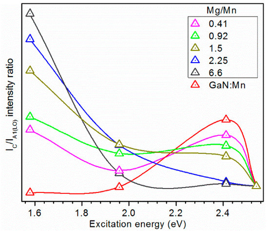 The intensity of the Mn-induced mode C in GaN:Mn is the highest for an excitation energy of 2.41 eV, as evidenced in Figure 4. This resonance gradually weakens with increasing Mg/Mn ratio in the Mg co-doped samples, while a resonance at 1.58 eV is detected.