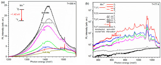 To probe the electron energy structure of the Mn impurity and to study the nature of the observed non-trivial enhancement of the Mn-induced phonon modes under sub-band excitation, PL spectroscopy was performed. The investigated GaN:(Mn,Mg) samples revealed two PL peaks at ~1.42 eV (Figure 6a) and at ~1.05 eV (Figure 6b), respectively, with intensities which depend on the Mg/Mn ratio. The feature at ~1.42 eV is attributed to the 5T2-5E intra-center transition of Mn3+ [24]. This PL line is most intense for GaN:Mn, and it gradually quenches with increasing Mg content (increase of the Mg/Mn ratio). The elusive intra-center photoluminescence of Mn3+ [21,24] is captured here, due to the specific resonant conditions of optical excitation close to the 5T2-5E transition of Mn3+. The PL peak at ~1.05 eV in GaN:Mn co-doped with Mg was shown to be related to internal transitions of the Mn5+ ion predominantly in the Mn-Mg3 configuration [22].