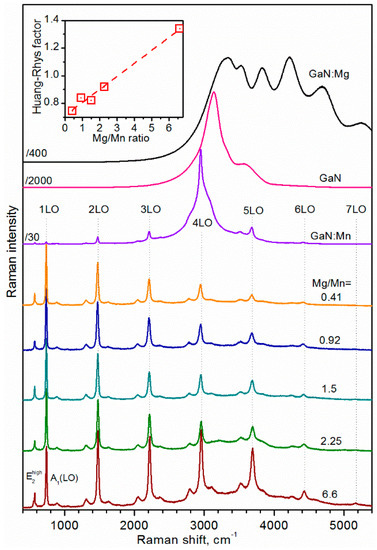 The resonance Raman spectra for the GaN:(Mn,Mg) samples excited by an inter-band excitation of 3.82 eV are shown in Figure 7. The inter-band luminescence collected from the Mg-doped and undoped GaN significantly drops in intensity in the case of the Mn-doped samples, whereas multiphonon Raman scattering is detected. The first-order and A1(LO) phonon peaks of GaN are well-resolved at 571 cm−1 and 735 cm−1, respectively, and a strong resonance Raman scattering of the A1(LO) phonon is observed up to the seventh order. For excitation energies greater than the bandgap of GaN, the observed process is related to outgoing resonant Raman scattering (ORRS).