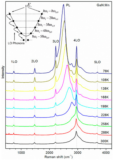 The behavior of multi-phonon Raman scattering, which is governed by the resonance with the band gap, can be tuned with temperature. The resonance Raman spectra of GaN:Mn at various temperatures in the range (78–300) K are shown in Figure 8. Besides causing a high-energy shift of the near-band edge (NBE) PL, the reduction of the temperature results in an enhancement of the multi-LO-phonon scattering, especially noticeable for the third and fourth order phonon scattering.