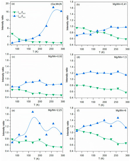 Temperature dependence of the I3LO/I2LO and I4LO/I3LO intensity ratios for GaN:Mn (a) and GaN:(Mn,Mg) with different Mg/Mn ratio (b–f).