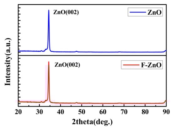 The X-ray diffraction curves of ZnO films with and without SF6 plasma treatment are shown in Figure 1. It can be seen that there is a single diffraction peak at 2θ = 34.4°, which represents the ZnO (002) diffraction peak according to the standard diffraction pattern (JCPDS 36-1451) [,]. This indicates that the deposited ZnO films are single phase films with hexagonal wurtzite structure, grown in a direction perpendicular to the c-axis of the substrate. The structural properties of ZnO films can be characterized by the peak shift and the peak width, i.e., the full width at half maximum (FWHM) of ZnO (002) peak. The ZnO (002) peak width is 0.46° and 0.44°, respectively for the original and the SF6 plasma treated ZnO films.
