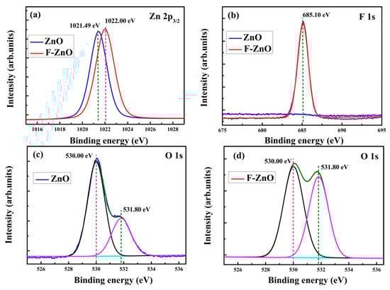 The chemical state of the ZnO surface was analyzed by XPS. The XPS spectrums of Zn 2p3/2, F 1s, and O 1s of ZnO films treated by fluoride plasma are shown in Figure 3. The peak binding energy of non-passivated ZnO (Zn 2p3/2) films is 1021.49 eV [], as shown in Figure 3a. The peak moves to 1022.00 eV by fluoride plasma treatment, and a 0.51 eV peak shift is found. The inner electron binding energy of zinc in Zn-F bonds is higher than that of zinc in Zn-O bonds, so the Zn 2p3/2 peak of ZnO films by SF6 plasma passivation shifts to a higher energy position. Sulfur is not detected in the XPS measurement of S 2p by SF6 plasma treatment, indicating that the passivation is achieved by fluorine ions. The XPS spectrum of F 1s is shown in Figure 3b; it is seen that the Zn-F bond (685.10 eV) is found after passivation []. The O 1s peak of ZnO films is shown in Figure 3c,d. The peaks with binding energy of 530.00 eV and 531.80 eV are Zn-O bonds and Zn-OH bonds, respectively [,]. The ratio of the peak area of Zn-O bonds and Zn-OH bonds is calculated to be 2.21 and 1.16, respectively, for non-passivated and passivated samples. It is shown that the -OH bonds increase after the passivation of fluorine ions. Because fluorine ions with strong electronegativity can attract hydrogen in the air, fluorine/hydrogen can combine with the oxygen dangling bonds to form intermolecular hydrogen bonds F/HO.