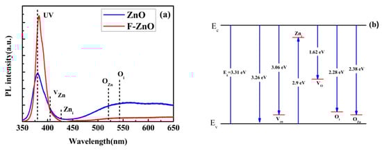 (a) The photoluminescence (PL) of ZnO films with and without SF6 plasma treatment and (b) the energy level diagram of ZnO.